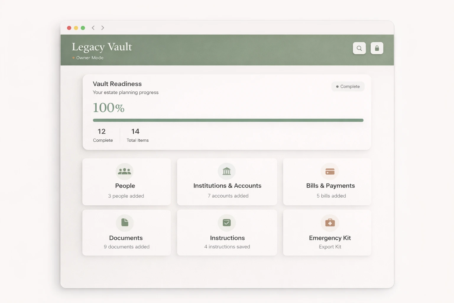 Legacy Vault runs entirely on your device. No internet connection is required after installation. Your sensitive estate information never touches a server.